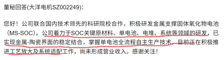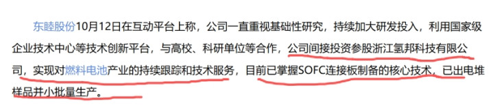 SOFC燃料电池:在互动平台上表示,目前公司联合国内技术领先的科研院校积极开展金属支撑固体氧化物电池(MS-SOC)关键原材料、单电池、电堆、系统等领域的研发,已实现金属-陶瓷界面的稳定结合,掌握单电池全流程自主生产技术,目前正在积极推进工艺放大及系统适配工作。