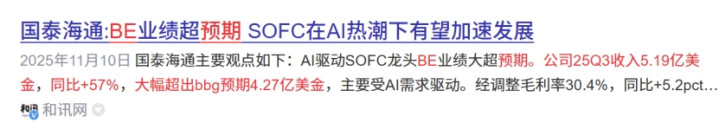 SOFC巨头BloomEnergy业绩远超预期也进一步佐证了SOFC进入加速发展中。数据显示,公司25Q3收入5.19亿美金,同比+57%,大幅超出bbg预期4.27亿美金。