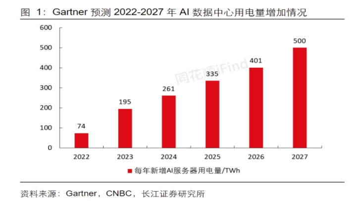 Gartner预测,未来两年数据中心的用电量预计将增长高达160%,到2027年,数据中心运行新增AI优化服务器所需的用电量将达到每年500太瓦时(TWh),是2023年新增用电量2.6倍。