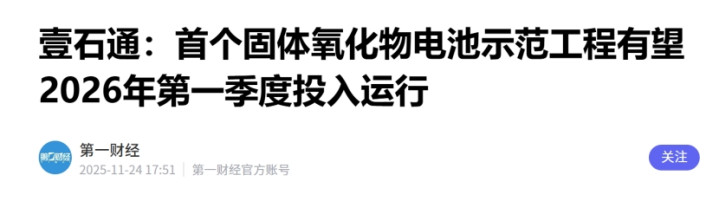 中信证券表示,看好海外数据中心建设这一确定性投资主线,SOFC凭借其高能量转换效率、快速部署以及低碳潜力高度匹配数据中心用电特征,有望实现需求快速增长,并带动上下游企业业绩释放。