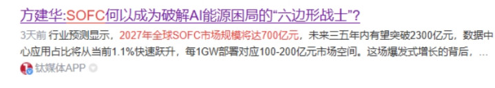 根据行业预测显示,2027年全球SOFC市场规模将达700亿元,未来三五年内有望突破2300亿元,数据中心应用占比将从当前1.1%快速跃升,每1GW部署对应100-200亿元市场空间。